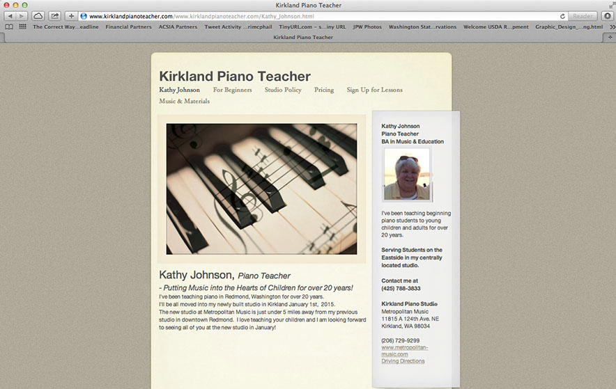 Kathy Johnson, Kirkland Piano Teacher wanted a simple site for studio info and music and materials. Kathy has been teaching for over 25 years at the same studio and needed a site for her new piano studio location.