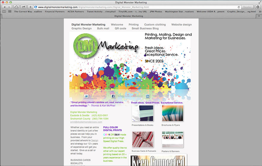 Digital Monster Marketing Full Service Digital Printing Company. Bright colors, modern design showcasing the full color digital specialty printing. This family owned business features graphic design, printing, mailing and marketing for businesses.