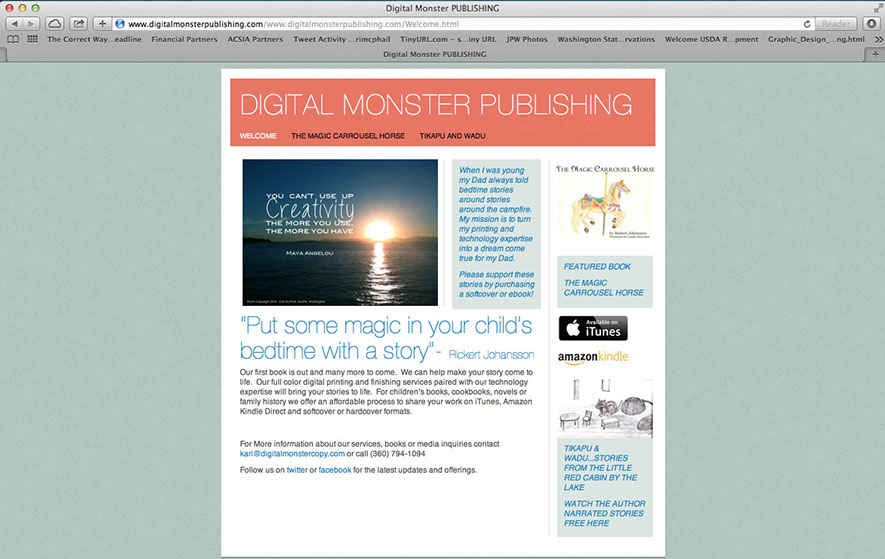 "You can't use up creativity, the more you use, the more you have." - Maya Angelou Digital Monster Publishing features local authors self-published books. Soft and welcoming the color scheme and layout is meant to be appealing to the whole family.