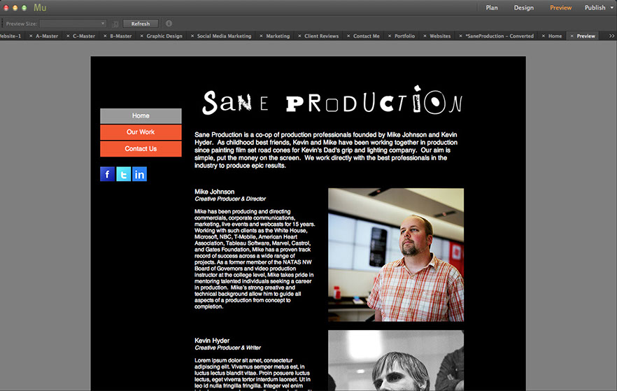 Sane Production logo and site for photography and videography combines style and influence to showcase work from Mrs. Obama, Microsoft, T-Mobile and more.