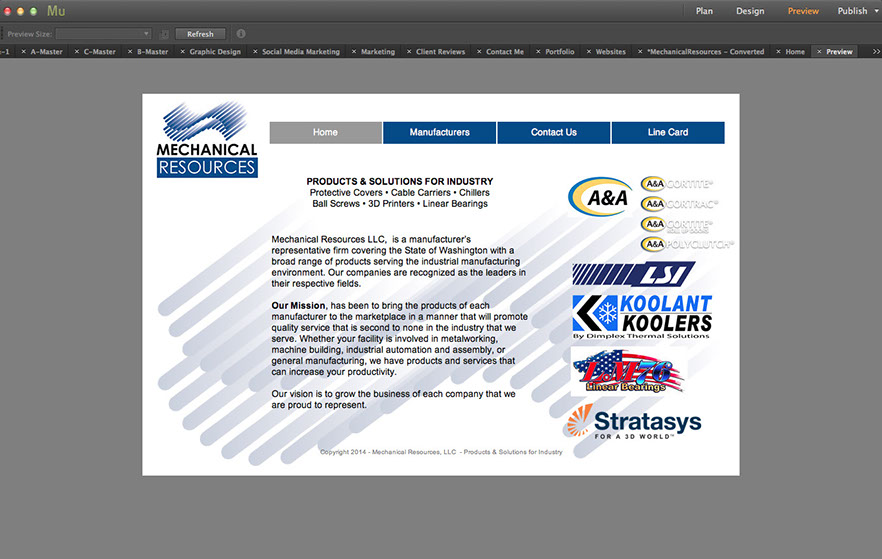 Mechanical Resources features the newly designed logo prominently. The logo was designed to echo the mechanical products sold for industry. The site was designed to be simple, clean and get clients the industrial information they need quickly.
